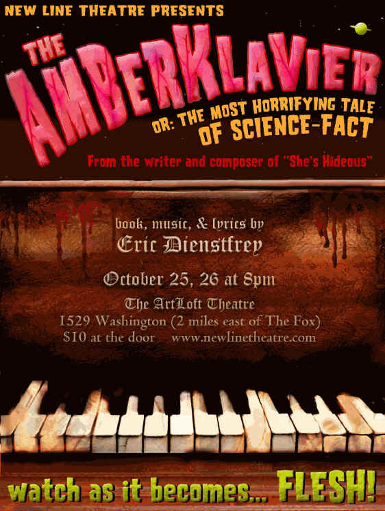 THE AMBERKLAVIER runs two nights only, Tuesdays and Wednesdays, Oct. 25-26, 2005, at 8:00 p.m. at the Art Loft Theatre, 1529 Washington. Tickets are $10 and available only at the door. SPECIAL WEB OFFER: Come dressed as David Bowie and get in for half price! New Line Theatre receives funding from the Regional Arts Commission, the Missouri Arts Council and the Arts and Education Council of Greater St. Louis.