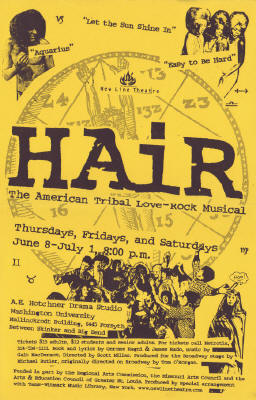 “When a director revives a play less than a year after he first staged it, he better have good reason – reasons like style, audience appeal and abundant energy. New Line artistic director Scott Miller has all the reason he needs for this summer's revival of last summer's hit, Hair. . . [It] is, above all, an ensemble piece. It emerged from a time when it seemed possible that group efforts to change society could succeed. This play, and New Line's production of it, succeed on exactly those same terms.” – Judith Newmark, St. Louis Post Dispatch