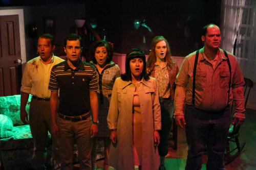 then this man started walking up the road,He came slowly, And Johnny kept teasing, He’s coming to get you, Barbara... And I laughed at him and I said, Johnny stop! I’m not afraid! Then off Johnny ran, And I went up to this man, I was going to apologize... And I looked up and said, Good evening. He grabbed me. He ripped me. He held me. He ripped at my clothes. And I screamed, Johnny help me! — Night of the Living Dead New Line Theatre opened its 23rd season with the regional premiere of NIGHT OF THE LIVING DEAD, the taut musical thriller based on the classic 1968 George Romero film. From the dynamic team of writer-lyricist Stephen Gregory Smith and composer-lyricist Matt Conner (Nevermore, Partial Eclipse, The Hollow) comes this powerful psychological thriller, re-imagining Romero's iconic walpurgisnacht for these times, zeroing in on the relationships among seven doomed strangers, who just may be the living dead themselves. The New Line cast included Zachary Allen Farmer (Ben), Marcy Wiegert (Barbra), Mike Dowdy (Harry), Sarah Porter (Helen), Joseph McAnulty (Tom), Mary Beth Black (Judy) and Phoebe Desilets (Karen). The show was directed by Scott Miller, with costume design by Marcy Wiegert and Sarah Porter, with lighting and scenic design by Rob Lippert, and with sound design by Kerrie Mondy. Like the Romero films, and with a nod to Jean-Paul Sartre's iconic play No Exit and its central theme that Hell is Other People, this claustrophobic story asks Big Questions. Could these seven people be trapped in this house for eternity, reliving the last night of their lives over and over? In this post-9/11 world, the story's metaphorical resonance has evolved. While the 1968 film was about the Culture Wars, the stage musical is about even more existential threats. Who are the zombies outside? When the Bad Guys look just like the Good Guys, how can we know who “they” are, and can we ever really be safe from "them"? Or could it be true, as the comic strip character Pogo once famously said, that "We have met the enemy and he is us."