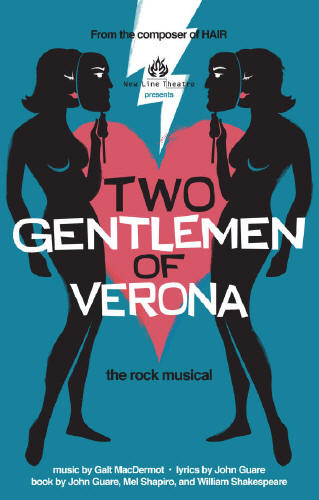 Trade my strait-jacket for A wedding veil, Throw away my needle and spoon. Sado-mas And all that jazz Lobotomized Right out of my brain! – Two Gentlemen of Verona, The Rock Musical With music from the composer of Hair, lyrics by the author of Six Degrees of Separation, and a book (more or less) by the guy who brought us Hamlet, New Line continued its 20th season with the rowdy, carnal, thoroughly subversive TWO GENTLEMEN OF VERONA. Set in Renaissance Verona and Milan – or maybe it's New York City in 1971 – composer Galt MacDermot, playwright John Guare, and writer-director Mel Shapiro have taken one of Shakespeare's least produced plays and breathed outrageous, new, cross-dressing life into it. TWO GENTS is a romantic comedy that explores issues of race, gender roles, the politics of war, and the sad reality that most men are pigs. The story tells of lifelong friends Proteus and Valentine who leave their rural hometown of Verona to experience life in the big city of Milan. But the course of true love – or is it just lust? – never did run smooth...